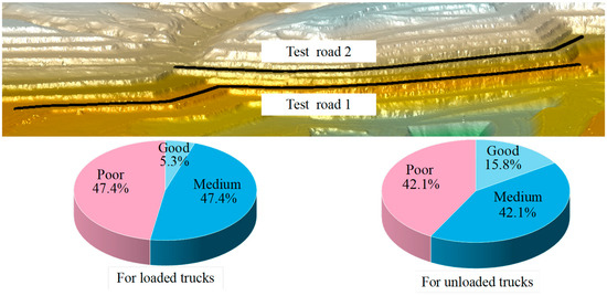 The primary objective of road classification is to enhance the economic efficiency of truck transportation by reducing fuel consumption. To analyze the economic benefits of the proposed fuel-efficient road classification method, two additional haul roads in the Haerwusu open-pit coal mine were selected (Figure 9). Two roads with relatively smooth southern benches were chosen for the case study. The testing involved measuring the IRI of these two roads in segments at 150 m intervals, and the relevant road selections and statistical data are presented in Figure 14. For both loaded and unloaded trucks, the selected roads were evenly distributed between “medium” and “poor” quality roads, with only a limited number of “good” quality roads.