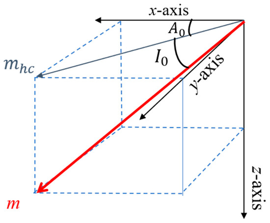 where and are the inclination and declination of the Earth’s magnetic field, respectively, and are the inclination and azimuth of the magnetic dipole source, as illustrated in Figure 1, and is the projection of the magnetic dipole moment vector onto the x-y plane, with and as shown in Figure 1. , .