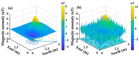 Simulation of a magnetic dipole source. (a) Magnetic dipole source without noise. (b) Magnetic dipole source with −5 dB noise.