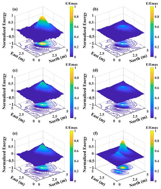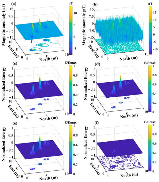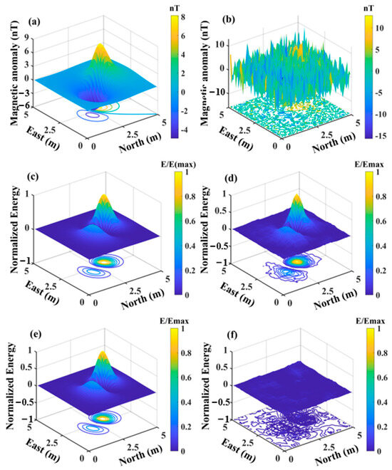 After the introduction of −5 dB noise, discerning any dipole source targets in the figure becomes nearly impossible, as the noise completely submerges the magnetic dipole source anomalies. Figure 3 indicates that panels (a) to (e) represent the coefficients , and panel (f) displays the sum of the squares of these five coefficients . Figure 3f indicates that the signal location is successfully recovered after processing with the two-dimensional orthogonal basis, with the noise being almost entirely suppressed. The research and proof presented in [39] demonstrate that the energy peak and distribution of the sum of squares are only related to the horizontal position, burial depth, magnetic moment magnitude, and direction of the magnetic dipole source, forming the basis for subsequent parameter estimation.