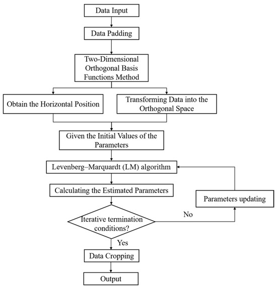 Figure 4 depicts the flowchart of the LM-OBF algorithm, where boundary effects are initially mitigated by performing edge expansion on the input data. Then, a two-dimensional orthogonal basis decomposition is conducted to obtain the coefficient square sum energy as the forward modeling equation. The horizontal position of the magnetic dipole source is calculated based on the energy peak of . After setting the initial values of the parameters, the LM algorithm updates the parameters. Once the iterative termination conditions of the optimization algorithm are met, the final results of the parameter estimation are output, achieving the parameter estimation of the magnetic dipole source.