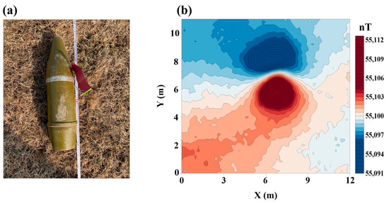 The experiment was conducted at a site in Changchun City, Jilin Province, China, with the test area covering 12 × 11 m. This experiment simulated a realistic measurement scenario of unexploded ordnance (UXO) targets using an unmanned aerial vehicle (UAV) magnetic survey system. The magnetic measurement platform utilized was a multi-rotor airborne magnetic survey system, and the flight platform was a DJI M300 RTK multi-rotor UAV designed for autonomous flight along a pre-planned flight path with enhanced flight stability. The measurement instrument was a compact, high-precision rubidium optically pumped scalar magnetometer with a maximum sampling rate of 10 Hz. The UXO target consisted of a safely deactivated 122 mm caliber artillery shell casing buried at a depth of approximately 0.7 m to simulate an actual measurement site. The UAV magnetic survey system maintained a flight height of 1 m, a flight speed of 1 m/s, and a line spacing of 1 m, and the sampling rate of the magnetometer was set at 10 Hz to ensure high data quality. Figure 11 illustrates a schematic of the UXO target and the raw magnetic anomalies measured without processing (the actual coordinates have been replaced by distances).