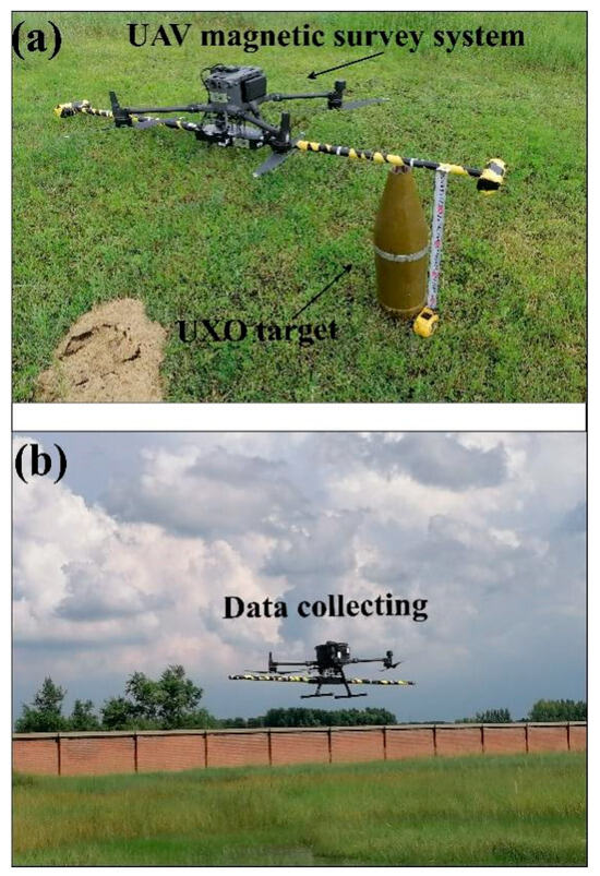 (a) UXO target and UAV magnetic survey system. (b) Conducting survey line flight and data acquisition.