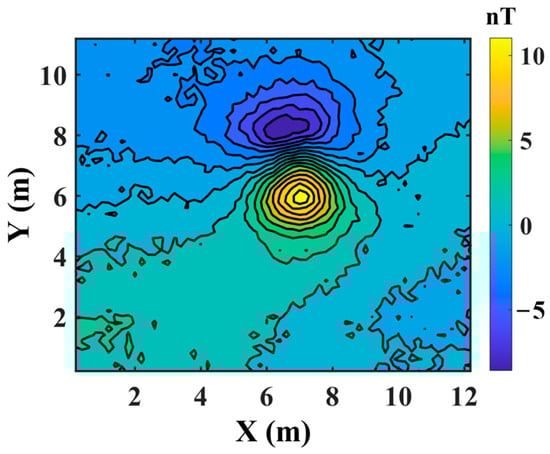 Figure 12 depicts the schematic diagram of the UAV aerial magnetic system and the simulated UXO target. The measured magnetic anomalies were processed to isolate the magnetic anomalies attributable only to the target. Utilizing the International Geomagnetic Reference Field (IGRF), the local normal geomagnetic field was calculated at 55,148 nT. The team subtracted this normal field value from the measurement data to eliminate the geomagnetic background field. In addition, they subtracted the mean value of the data to ensure that the average baseline of the anomaly data was zero. The processed data are displayed in Figure 13.