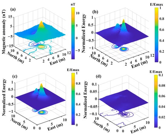 When the distance between a magnetic dipole source and the measurement sensor exceeds 2.5 times the size of the magnetic source, the anomaly generated by the target magnetic source can be considered characteristic of a magnetic dipole. This assumption is consistent with most “far-field” detection scenarios. In measurements involving objects such as UXO, while modeling techniques based on ellipsoidal magnetic dipoles that account for their self-demagnetization effects have significantly advanced, practical limitations remain. Specifically, the UXO’s dimensions, burial depth, and the distance between the sensor and the target cause the response from self-demagnetization effects induced by the target’s shape characteristics to attenuate with distance, complicating detection in practical applications. Therefore, the point dipole forward modeling formula sufficiently addresses most detection scenarios [40,41,42]. The response of the magnetic dipole source is expressed by the following relation [43].