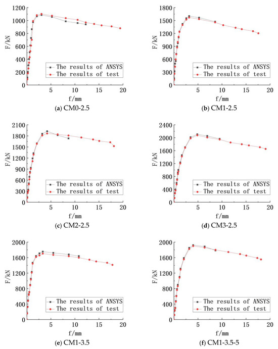 Figure 4 depicts the load versus displacement of mid-span curves, which were drawn after the extraction of ANSYS calculation results. It reflects the failure process of concrete-filled circular CFRP–steel middle long columns. When the bearing capacity is less than 95%, the mid-span deflection increases uniformly and slightly. When the bearing capacity is more than 95%, the mid-span deflection increases significantly. When the ultimate bearing capacity is reached, the outer CFRP will break suddenly after brittle failure, and the deflection begins to increase greatly as the bearing capacity drops rapidly. So, the bearing capacity at the falling point is the ultimate bearing capacity of the member. If the load continues to be applied, obvious bending of the circular steel pipe can be seen. According to the curve, the calculation results of ANSYS are in good agreement with the test results, and the error is small. The simulation error of CM0-2.5, CM3-2.5, CM1-3.5-5, and CS1-4.25 is only 1%. It can be seen that the simulation is accurate and conducive to the analysis of the test.