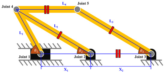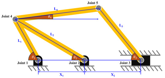 In addition to the height variation of Joint 4, changes in position of Joint 1 also affect height of Joint 5. Typically, the height variation of Joint 5 is expressed by a highly complex equation; however, it can be simplified under certain conditions. Specifically, as illustrated in Figure 1, when linkage lengths satisfy the condition that lengths L2 and L3 are equal and lengths L4 and X2 form a parallelogram structure, the height of Joint 5 always equals the height of Joint 4. A significant advantage of this parallelogram linkage structure is that the angle between the upper and lower surfaces remains unchanged during height adjustment, effectively achieving independent control of height and angle, one of the primary goals established in this study.