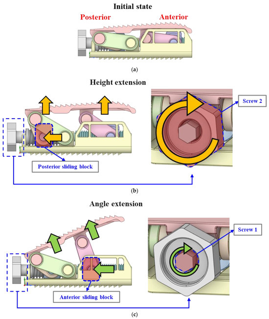Expansion method of spinal cage. (a) Posterior and anterior in initial state. (b) Height extension. (c) Angle extension.