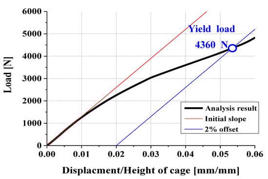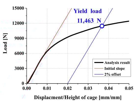 As shown in Figure 6 and Figure 7, compression analysis results are as follows: yield load is determined at the intersection of the blue line, offset by 2% from the initial slope, and for the load–displacement curve, the yield load is 11,463 N, exceeding the allowable criterion of 6371 N. Therefore, the designed expandable cage meets mechanical performance objectives under compression load. The initial yield occurs at a compression load of 1920 N on the axis of Sliding Block1.