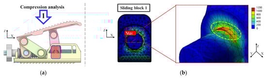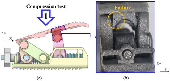 Through FEM analysis, structural stress distributions and failure modes were predicted, demonstrating a high correlation with the failure locations and patterns observed experimentally. Under compression loading, FEM analysis predicted stress concentration and potential failure in the anterior linkage region. Correspondingly, experimental tests confirmed failure at the anterior sliding block shaft and its corresponding shaft in the upper plate, aligning with the FEM predictions.