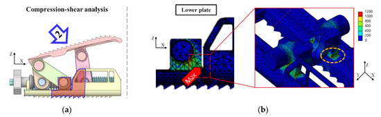 For compression–shear loading conditions, FEM analysis predicted failure at the lower plate shaft, closely matching observed experimental failures. These findings underscore the FEM model’s capability to accurately predict structural stress distribution and failure modes, highlighting its potential for reliable performance forecasting and optimization in early design stages without relying on physical prototypes.