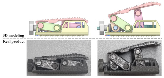 As shown in Figure 10, to conduct bench testing of FEA-verified model, a specimen was fabricated. Additive manufacturing was employed to overcome the low machinability of the Ti-6Al-4V material and to achieve a small size with complex geometries. A specimen was produced using an SLM metal 3D printer with an expected dimensional accuracy of approximately ±0.1 mm due to limitations in precision. To compensate for this tolerance and ensure smooth assembly and operation, a model with a 0.2 mm clearance was designed and fabricated.