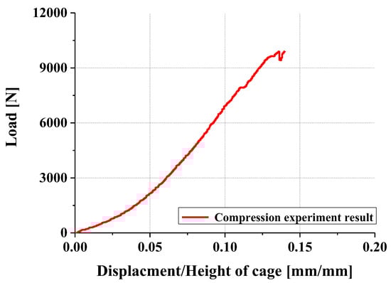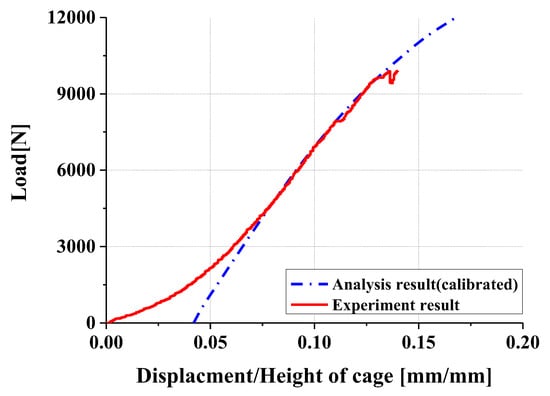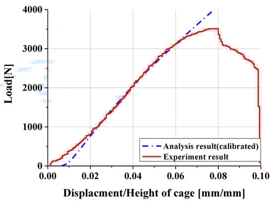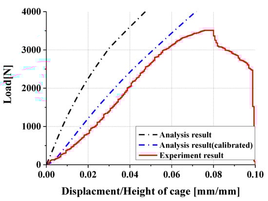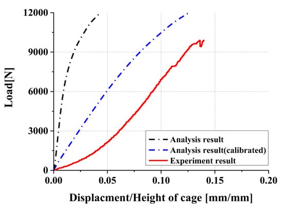 FEM analysis was utilized to predict the mechanical behavior of the expandable cage and compared with actual mechanical testing results. As shown in Figure 16 and Figure 17, differences between FEM simulations and experimental outcomes were observed. The primary cause of these differences was attributed to the deformation of the testing equipment. During experiments, the test apparatus underwent slight elastic deformation under load, which was not considered in the FEM analysis. To compensate, tests compressing only the equipment without specimens were conducted, revealing approximately 0.11 mm deformation under a 1000 N load. This data allowed for the calculation of equipment deformation corresponding to applied loads, which was then integrated into the FEM analysis for calibration.