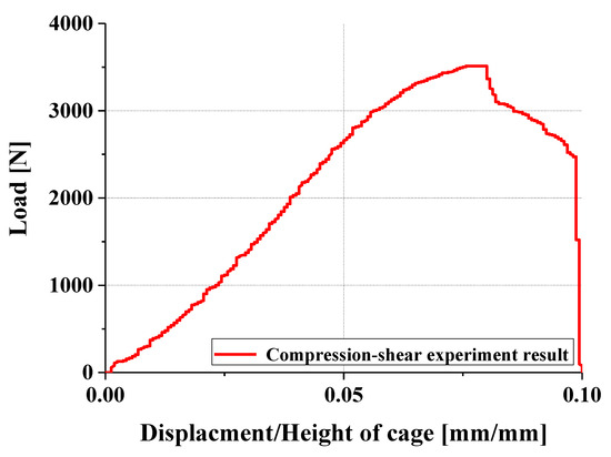 Next, in compression–shear test results, as shown in Figure 14, ultimate load was 3315 N, which surpasses FDA-approved fifth percentile ultimate load of 1996 N. Thus, the current model also meets performance targets in the compression–shear test. As shown in Figure 15, failure occurred at edge of the column where the axis of the lower plate is located.