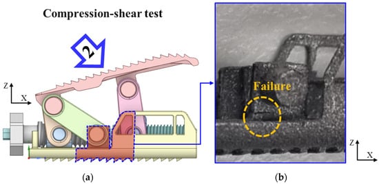 Failure in compression–shear test. (a) Part where failure occurred. (b) Area where failure occurred.