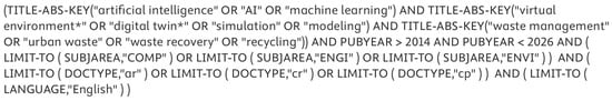 A systematic literature selection process was conducted following the PRISMA guidelines, aimed at identifying the most relevant academic contributions to the use of Artificial Intelligence (AI) and Digital Twins (DT) in the context of sustainable waste management. The Scopus database served as the primary source, and a structured set of inclusion and exclusion criteria was applied to ensure thematic coherence and the scientific rigor of the selected publications [19,20].