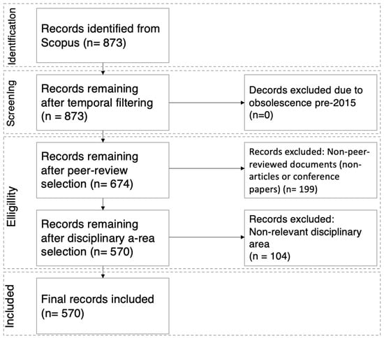 In the identification phase, records were collected through the application of a precisely defined Boolean query. During the screening phase, non-peer-reviewed materials were excluded. The eligibility step entailed a manual assessment of the disciplinary relevance of each document. Finally, in the inclusion phase, only those records that fully met both methodological and thematic requirements were retained for analysis [23,24].