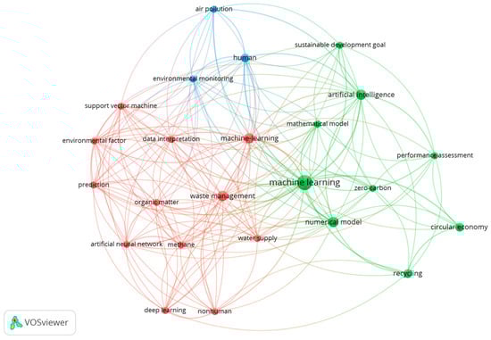 The VOSviewer mapping organizes interconnected keywords into three distinct thematic clusters, each represented by a different color for visual clarity. These clusters represent distinct yet interconnected areas of research in the application of artificial intelligence and digital technologies to sustainable waste management.