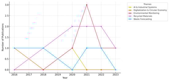 The line graph below (Figure 4) illustrates the emergence and evolution of five major research themes: waste forecasting, recycled materials, environmental monitoring, digitalization and circular economy, and AI and industrial systems. The data reveal three distinct phases: an initial focus on forecasting and isolated applications of AI (2016–2018), followed by an expansion into recycled materials and optimization (2019–2021), and finally, a surge in environmental and industrial integration with Digital Twins and deep learning (2021–2023).