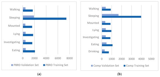 16], in order to validate the model’s efficacy. The dataset comprises 11,862 photos in six categories: Lying, Sleeping, Investigating, Eating, Walking, and Mounted. The training set comprises 9344 photos, while the validation set contains 2518 images. The category-wise sample distribution of the PBRD dataset is shown in