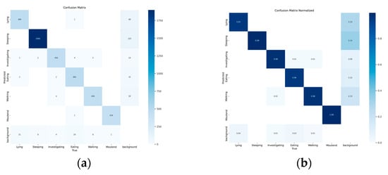 Figure 7a displays the absolute prediction counts, indicating that the model demonstrates excellent classification performance for behaviors such as Sleeping (with 1900 correct predictions), Mounted (434), and Lying (466), showcasing its strong ability to accurately distinguish these categories. However, some misclassifications are observed in categories such as Investigating and Eating, where visual similarity and complex image backgrounds occasionally cause samples to be confused with the background or other behavior types.