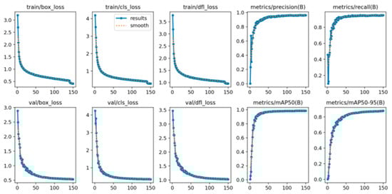 Figure 9 exhibit a notable alteration in the loss levels by the 50th iteration. Following 150 iterations, box_loss decreases to 0.41 and cls_loss reduces to 0.24, demonstrating a comparable trend in the validation set and signifying the model’s efficacy in target localization and classification tasks. The value of the loss function currently oscillates within a narrow range, indicating convergence and improved outcomes.