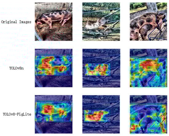 To further analyze the model’s detection performance and visually demonstrate the improvement effects, in this paper, three behavioral images of domestic pigs were selected for heat map visualization. The heat map is a visualization tool that can visually present the distribution of data, the area of interest of the model, and the importance of features in a color-changing manner. In the heatmap, each data point is assigned a specific color, with the shade of the color reflecting the data intensity at that location. We use warm colors (e.g., red) to represent high-intensity areas and cool colors (e.g., blue) to represent low-intensity areas. In this paper, a gradient-based CAM (Grad-CAM) method is used to obtain the heat map of the model [