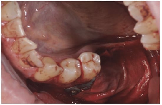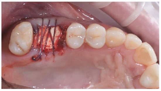 The surgical sites were then closed with Vicryl 4.0 simple sutures (Revello S.p.A, Verona, Italy) (Figure 4). After a healing period of three months, implant placement (Osstem Implant, Seoul, Republic of Korea) was performed according to the manufacturer’s instructions. Histological tissue samples were collected immediately before implant site preparation (see Section 2.3 and Section 2.4). The implant sites were prepared freehand, without a surgical template, using drills of increasing diameter. Bone quality was subjectively categorized as hard, medium, or soft. The motor torque was set to 35 Ncm during implant insertion. Implants were placed 1.5 mm below the intact buccal bone, and an immediate loading protocol was adopted with a minimum insertion torque of 35 Ncm. Post-surgical analgesic treatment with ibuprofen 600 mg was prescribed as needed. All patients were strictly followed to evaluate complete healing. Three to four months after immediate loading, definitive impressions were taken, and within one month, a screw-retained, implant-supported, single metal-free crown was delivered. Periapical radiographs were obtained at the time of implant placement (Figure 5).