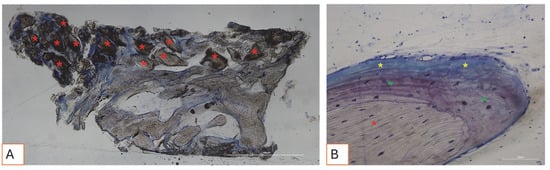 (A,B). Histological photomicrograph of hard tissue samples collected three months after socket preservation surgery, stained with Toluidine Blue and Yellow Pironin. (A) Overview of the sample. The portion of regenerated tissue is shown, rich in graft material (red asterisks), surrounded by newly formed bone. Below the red line, native bone is visible. Total magnification: 40X. (B) Higher magnification view showing a graft granule surrounded by bone undergoing different stages of mineralization, including woven bone (green asterisks) and osteoid matrix (yellow asterisks). Total magnification: 200X.