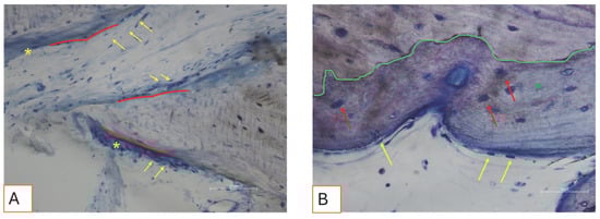 (A,B). Photomicrograph showing active bone cells. (A) Bone deposition lines (red lines) are visible, characterized by osteoblast-like cells (yellow arrows) actively secreting new osteoid matrix (yellow asterisks). Total magnification 200X. (B) A green line marks the interface between the graft material and newly formed woven bone (green asterisk). Red arrows indicate cells resembling immature osteocytes embedded within their lacunae in the woven bone tissue. On the surface, osteoblast-like cells are aligned along the bone margin (yellow arrows). Total magnification: 400X, Toluidine Blue and Yellow Pironin staining.