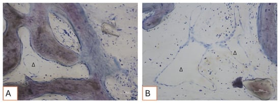 (A,B) Loose connective tissue surrounds the bone tissue. Delta “∆” symbols indicate blood vessels. Total magnification 200X, Toluidine Blue and Yellow Pironin staining.