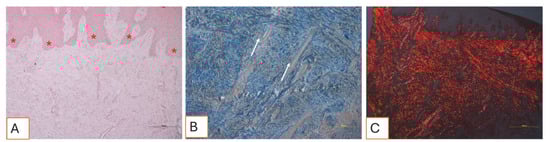 (A–C). Histological sections of soft tissue collected three months after the surgical procedure. (A) The tissue exhibits a physiological architecture. The connective papillae interfacing with the epithelium (red asterisks) display normal morphology. No signs of inflammation, necrosis, or tissue distress are observed. Total magnification: 100X, Hematoxylin and Eosin staining. (B) View of the dense connective tissue, characterized by tightly packed collagen fiber bundles and numerous small blood vessels (white arrows). Total magnification: 100X, Mallory’s Trichrome staining. (C) Under polarized light, the tissue appears to be slightly fibrotic: collagen fibers appear to be well defined, organized, and oriented in parallel, forming bundles consistent with post-surgical mature healing. Total magnification: 100X, Sirius Red staining.