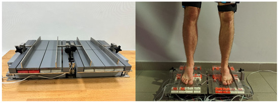 This study used a custom-built device (Figure 1) previously described in detail in [20]. The device is patented under the number PL243709. It enables simultaneous recording of the rotational moments of the lower limbs and the ground reaction forces for four anatomical support zones during standing. Force data is recorded over time, allowing use in both static and dynamic simulations. Measurement sensors with a maximum load of 200 N and an accuracy of ±0.03% were used to measure the moment of force. Sensors with a maximum load of 500 N and an accuracy of ±0.4% were used to measure the ground reaction forces.