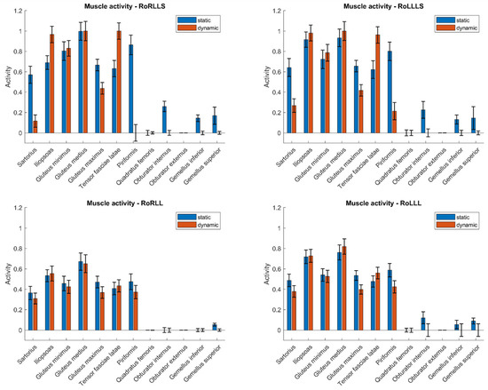 To compare the muscle activity values in both static and dynamic models, Figure 2 presents the results for a single subject across three types of simulations: rotation with both limbs, rotation with the right limb, and rotation with the left limb. These values are shown for the time point in the dynamic simulation at which the rotational moment for the respective limb was the greatest. This time frame from the dynamic simulation corresponded to the input data for the static simulation. Values are normalized to a maximum of 1. Confidence intervals may exceed the range [0, 1] due to statistical variation and normalization. These deviations reflect the uncertainty of the estimates and do not imply invalid or out-of-range measurements.