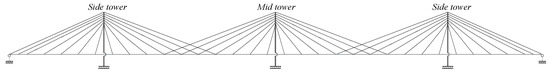 The crossing cable is set in an asymmetric arrangement, as shown in Figure 10. The crossing cable extends from the mid tower and intersects with the cable of the side tower as shown by the red line in the figure. The area of the crossing cable for both the side tower and the mid tower is 0.008 m2, and the stress of the crossing cable under the dead load is 600 MPa.