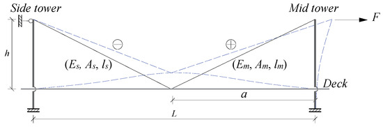 The structural form of setting crossing cables in the mid span of the three-tower cable-stayed bridge is shown in Figure 1. Chai et al. [15,16] analyzed the mechanical mechanism by which the crossing cables provide restraint to the bridge towers. When an unbalanced horizontal force is applied to the top of the mid tower, the change in the cable forces of a pair of crossing cables is shown in Figure 2. In the figure, the crossing cables are anchored at a distance a from the mid tower, with the main span length denoted as L and the tower height above the deck as h. When the mid tower deflects, the crossing cables of the mid tower are tensioned, resulting in increased cable forces that restrain the tower’s deflection. Meanwhile, the cable forces in the crossing cables of the side towers decrease. A portion of the dead load on the main girder originally borne by the side towers’ crossing cables is transferred to the mid tower’s crossing cables. This load redistribution maintains the force equilibrium of the main girder and enhances the structural stiffness.