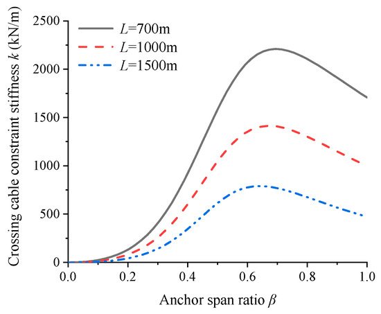The ratio of height to span is 0.25, the area of the cable is 0.008 m2, and the initial stress is 600 MPa. The cable is a high-strength steel wire, with an elastic modulus of 205 GPa and a specific weight of 78.5 kN/m3. The relationship between the crossing cable constraint stiffness k and the anchor span ratio β under different main span lengths is shown in Figure 3.
