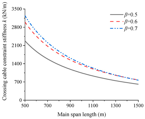 As can be seen from Figure 4, as the main span length increases, the constraint stiffness of the crossing cables continuously decreases. When the anchor span ratio β is 0.5, 0.6, and 0.7, the constraint stiffness of the crossing cables decreases by 73.04%, 74.09%, and 76.30%, respectively, as the main span length increases from 500 m to 1500 m. The main span length has a significant impact on the constraint stiffness of the crossing cables. This is mainly because as the span increases, the cable length increases and the sag effect increases, both of which reduce the axial stiffness of the cable.