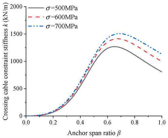 From Equation (5), it can be seen that when the height-to-span ratio and the material properties of the crossing cable are constant, the constraint stiffness k is related to the main span length L, the height-to-span ratio α, the ratio t of the crossing cable areas of the mid and side tower, the anchor span ratio β, and the initial stress σ. Based on Equation (5), the relationship between main span length L, anchor span ratio β, initial stress σ and crossing cable constraint stiffness k is analyzed. The ratio of the crossing cable area of the side tower to the mid tower is t = 1, and the relationship between the constraint stiffness of the crossing cable and the anchorage position (anchor span ratio), span length and initial stress of the crossing cable is studied, respectively.