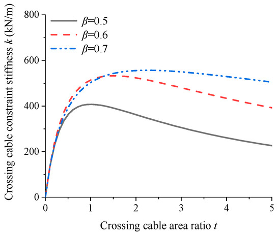 Based on Equation (7), the relationship between the ratio t of crossing cable area and its constraint stiffness k is discussed. Let the steel volume of a pair of crossing cables C = 8.90 m3. Figure 6 and Figure 7 show the relationship between the ratio t of crossing cable area and k, for main span lengths of 1000 m and 1500 m, respectively.
