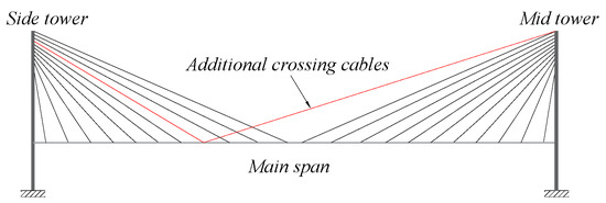 The mid tower of multi-tower cable-stayed bridges lacks the longitudinal constraint of backstays, resulting in insufficient overall structural resistance to deformation. Under live load, the deformations of the deck and towers are relatively large [7]. Measures to enhance the structural rigidity of multi-tower cable-stayed bridges primarily fall into two categories [8,9]: one is to increase the bending stiffness of the bridge towers; the other is to add stiffening cables to the main span. The Rion–Antirion Bridge [10] (with a main span of 3 × 560 m), the Millau Bridge [11] (with a main span of 6 × 342 m), and the Ma’anshan Yangtze River Bridge have adopted the first measure, which involves increasing the bending stiffness of the bridge towers to reduce the displacement of the towers and deck. The second measure mainly involves two schemes: setting stabilizing cables at the mid tower and setting crossing cables at the main span. The Ting Kau Bridge [12] (with two main spans of 448 + 475 m) has stabilizing cables set up along the bridge direction on both sides of the mid tower to increase the rigidity of the mid tower. The stabilizing cables at the mid tower need to span the entire main span. When the main span is long, its sag effect becomes more pronounced, greatly reducing its restraining effect. The Queensferry Bridge [13] (with two main spans of 2 × 650 m) and the Huangmaohai Bridge [14] (with two main spans of 2 × 720 m) have crossing cables installed at main spans to enhance the overall rigidity of the structure, which proves that this method can effectively improve the structural stiffness. However, as the length of the main span increases, the sag effect of the cables will reduce the axial stiffness of the crossing cables. For three-tower cable-stayed bridges with main spans up to the kilometer scale, there is still a lack of relevant research on the influence of the crossing cable on the structural performance and its optimal setting method.