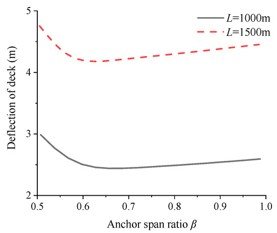 It can be seen from Figure 11 that when the main span length is 1000 m and 1500 m, the vertical deflection of the deck is the smallest when the anchor span ratio is 0.657 and 0.625. The maximum anchor span ratios of the crossing cable constraint stiffness given by the formula are 0.673 and 0.633, respectively. The relative errors between the theoretical value and the model value are 2.44% and 1.28%, respectively. One of the reasons for the error is that the influence of the bending stiffness of the deck is ignored in the formula, and assuming that the displacement of the side tower top is 0 also leads to some errors. The formula has high accuracy and can be used to determine the optimal anchorage position of the crossing cable in the long-span cable-stayed bridge.