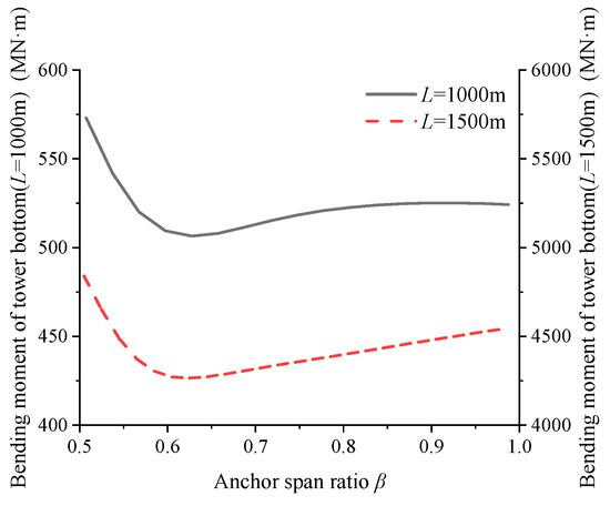 Figure 12 shows the bending moment of the mid-tower bottom under single-span loading when the crossing cable is anchored at different positions. It is noted that after adding a pair of crossing cables to the three-tower cable-stayed bridge with a main span of 1000 m, the anchor span ratio with the lowest bending moment at the tower bottom is 0.627. For the three-tower cable-stayed bridge with a main span of 1500 m, the vertical deflection of the deck and the bending moment at the tower bottom reach the minimum when the anchor span ratio is 0.625.