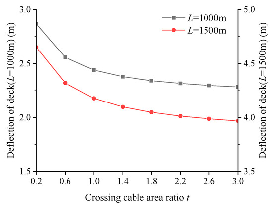Let the ratio of the cross-sectional areas of the mid-tower crossing cable and the side tower crossing cable be Am/As = t, where As = A. Equation (3) can be expressed as follows: