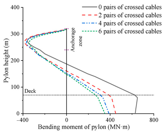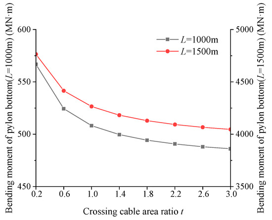 When different crossing cable area ratios are used, the bending moment at the mid-tower bottom is shown in Figure 14. It is noted that the bending moment of the mid-tower bottom decreases with the increase in the crossing cable area ratio. It can be seen that increasing the cross-sectional area of the crossing cable of the mid tower can improve the structural stiffness and reduce the bending moment of the mid-tower bottom.