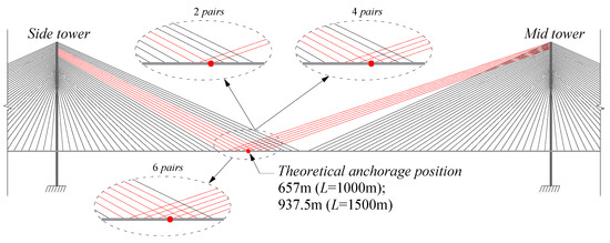 On the basis of two three-tower cable-stayed bridges, two pairs, four pairs, and six pairs of crossing cables are added, respectively, and the crossing cables are set near the position with the largest constraint stiffness. The anchorage positions of different numbers of crossing cables are set as shown in Figure 15. The red dots in the figure are the theoretical anchorage positions with the largest constraint stiffness of the crossing cables.