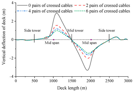 A pair of crossing cables are added to the main span and set at different positions to calculate the displacement of the deck under the uniform load of 40 kN/m. The loading method of uniform load is shown in Figure 8. Figure 11 shows the maximum vertical deflection of the deck when the crossing cables are set at different positions.