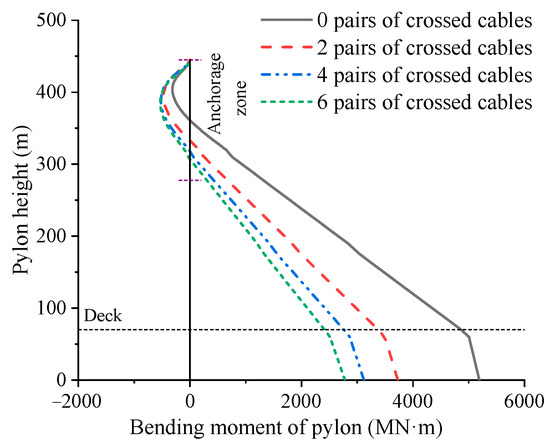 Figure 18 and Figure 19 give the bending moment distribution in the mid tower of two three-tower cable-stayed bridges after adding two, four, and six pairs of crossing cables. It is observed that significant bending moments occur in the anchorage zone of the mid tower for the bridge with a 1000 m main span. This is because the crossing cables are densely concentrated near the tower top, imposing strong longitudinal constraints that result in an “S”-shaped deformation of the tower. The bending moments at the tower base for the two bridges are 629.46 MN·m and 5190.73 MN·m, respectively. After installing two, four, and six pairs of crossing cables, the bending moment at the mid-tower bottom of the 1000 m main span bridge decreases by 28.41%, 38.28%, and 44.16%, respectively, while that of the 1500 m main span bridge decreases by 28.16%, 39.85%, and 46.47%, respectively. The addition of crossing cables in the main span significantly reduces the bending moment at the mid-tower bottom. For both span lengths, the reduction magnitudes of the tower base bending moment induced by crossing cables are comparable.