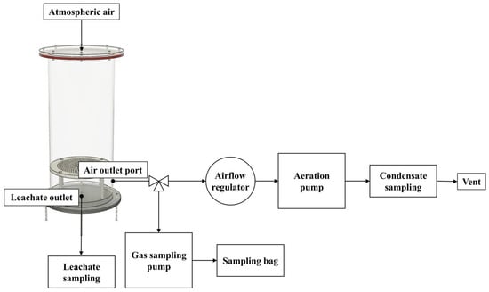 Each chamber had a perforated plate in the lower section to facilitate representative odorous gas and leachate sampling (Figure 1). To simulate the mixing of air within the bedding driven by external winds and the activity of cattle, an air pump (SWT-20, WITHUS AIR, Busan, Republic of Korea) was utilized to replace the internal air of the lab-scale reactor at a ventilation rate of 0.24 L min−1, ensuring that the reactor’s internal volume was exchanged approximately once per hour. External air entered through the air inlet port at the center of the reactor lid, passed through the perforated plate, and exited through the outlet port at the bottom.