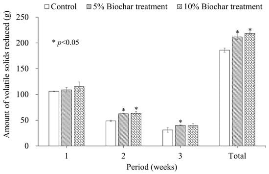 Figure 2 illustrates the weekly VS reduction across the experimental groups. During the first week, no significant differences in VS reduction were observed among the groups. However, significant differences emerged in the subsequent weeks. In the second week, VS reduction was significantly greater in both biochar treatments compared to the control. The 5% biochar treatment showed a 28.7% increase, and the 10% biochar treatment showed a 30.5% increase compared to the control (p < 0.05). A similar trend was observed in the third week. The 5% biochar treatment showed a significantly higher VS reduction (29.2%, p < 0.05) compared to the control. In the case of the 10% biochar treatment, the VS reduction (27.5%) was also higher than the control, with a p-value of 0.057. Although this does not meet the conventional threshold for statistical significance (p < 0.05), it may be interpreted as a marginally significant trend, suggesting a potential effect worthy of further investigation.